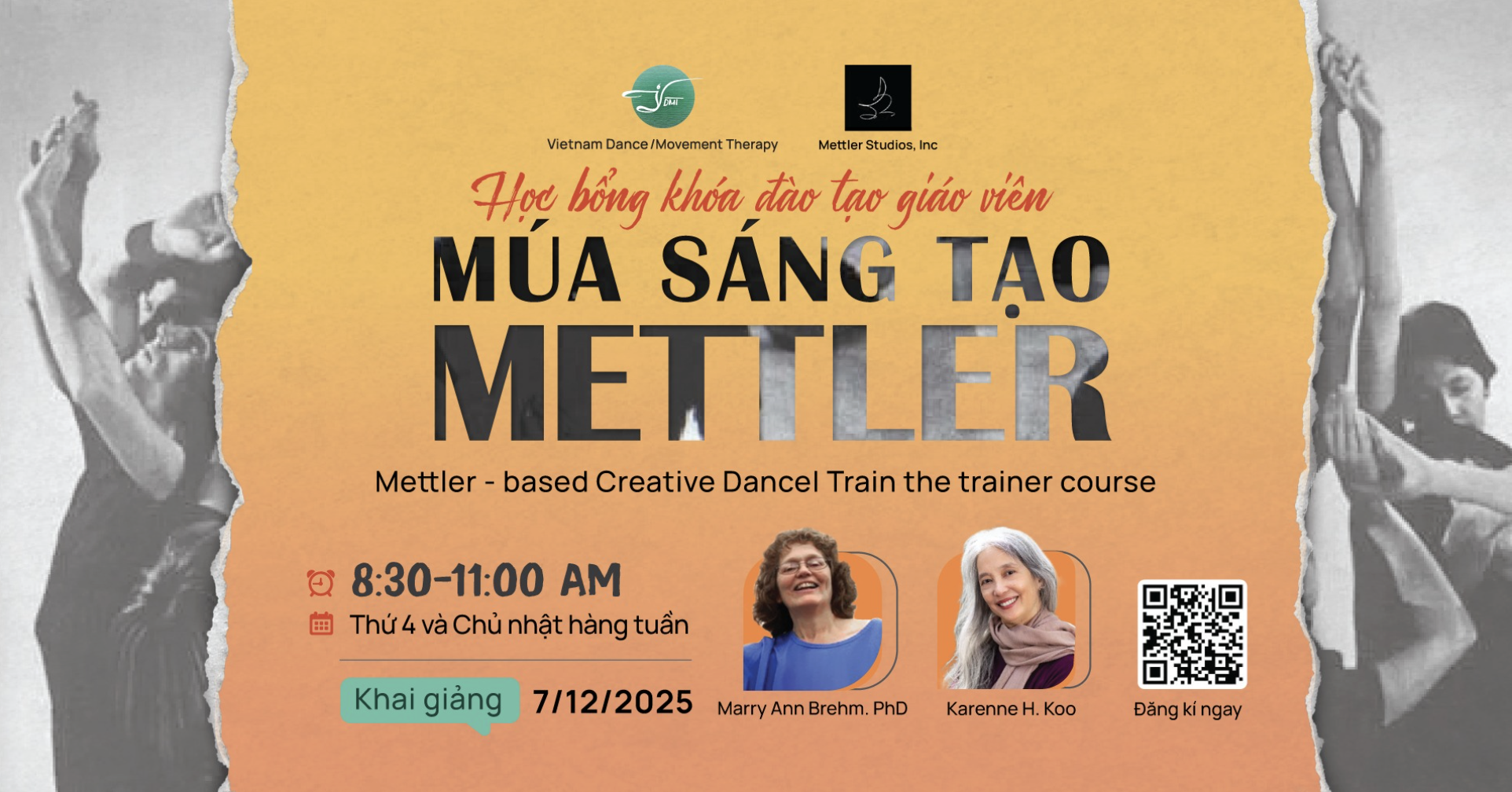 MÚA SÁNG TẠO theo phương pháp METTLER 2024 nâng cao và tiếp nối thành công từ khóa học 2022 và 2023. Đây là lần thứ 3 liên tiếp Mettler Studio Inc, Hoa Kỳ & Trị liệu Múa/chuyển động Việt Nam tài trợ và tổ chức với mục đích xã hội hóa và ứng dụng MÚA SÁNG TẠO theo phương pháp của Babara Mettler trong phát triển chuyên môn, và chăm sóc sức khỏe toàn diện cho cộng đồng Việt Nam.